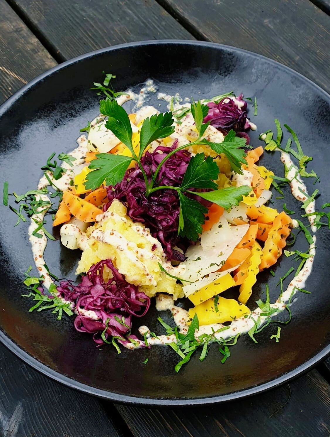 mit Rüebli, Kohlrabi, Rotkohl und Senfsauce