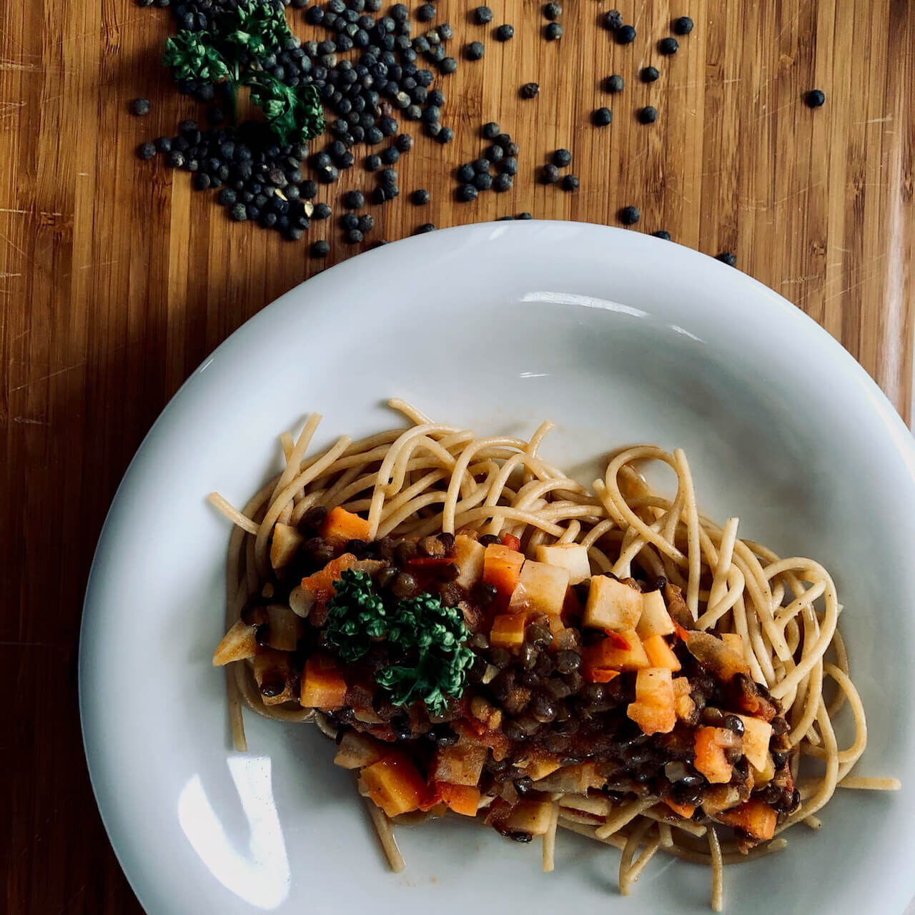 Vollkornspagetti mit Linsenbolognese